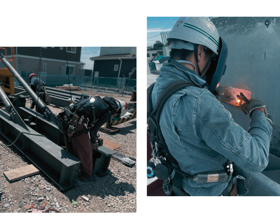 鉄骨工事はわずかな誤差が安全性を左右します。秀栄では、鍛え抜かれた職人が技術力と経験を生かし、ミリ単位の精度で鉄骨を組み上げます。品質に妥協せず、長く安心できる躯体づくりを提供しています。