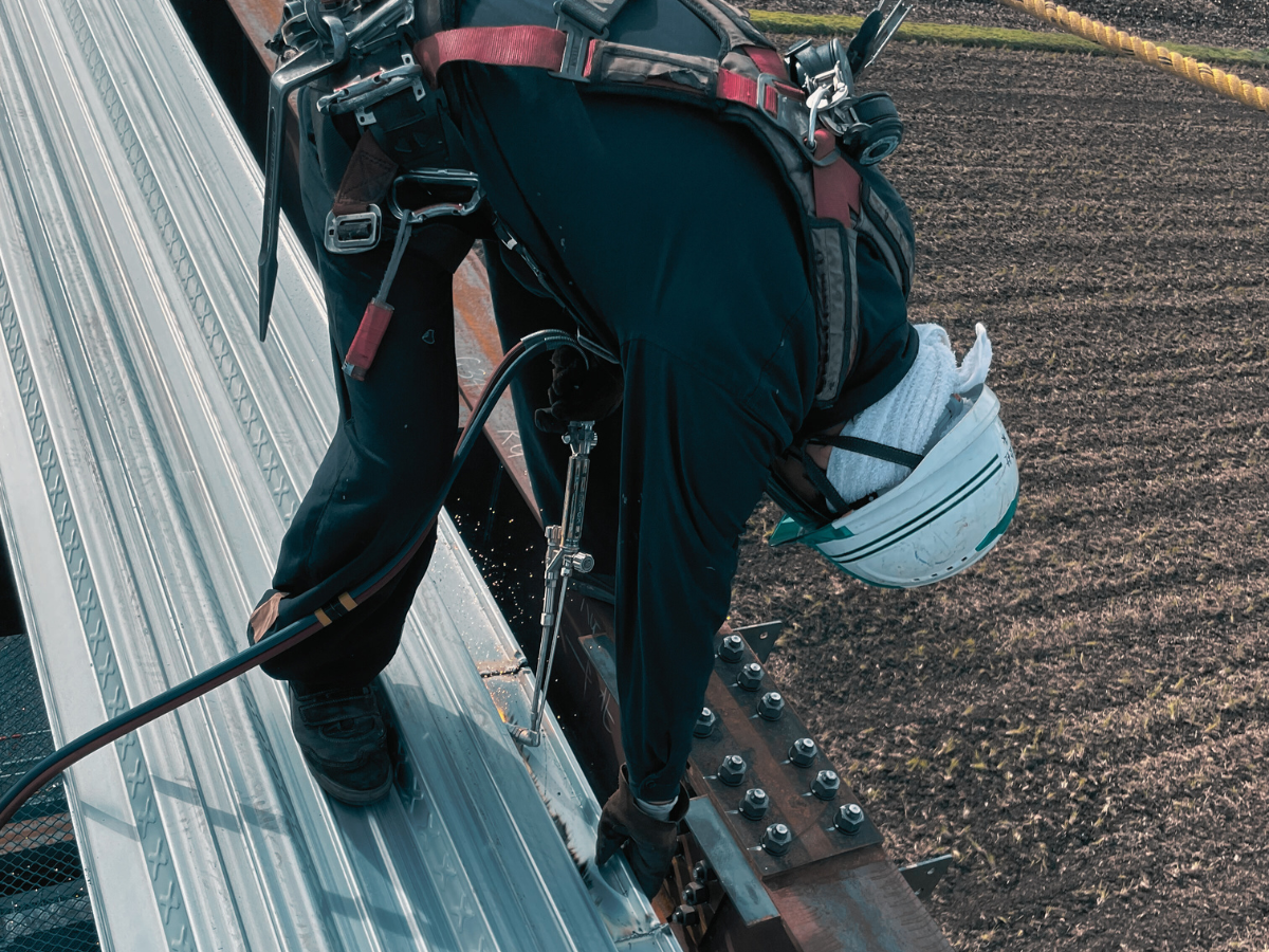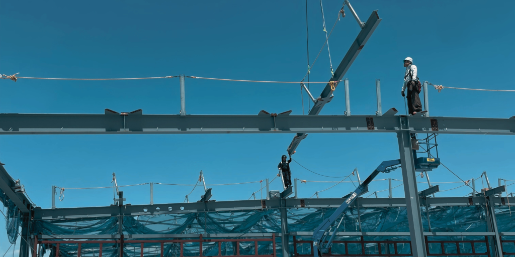 デッキ張りは鉄骨の骨組みに床となる鋼板を敷き詰め、建物としての形をつくる重要な作業です。隙間をつくらず精密に敷設することに加え、高所作業による安全配慮も欠かせません。
